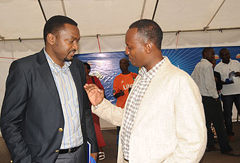 The CEO Ferwafa, Jules Kalisa chats with his colleague, the Vice President of Ferwafa, Raoul Gisanura.