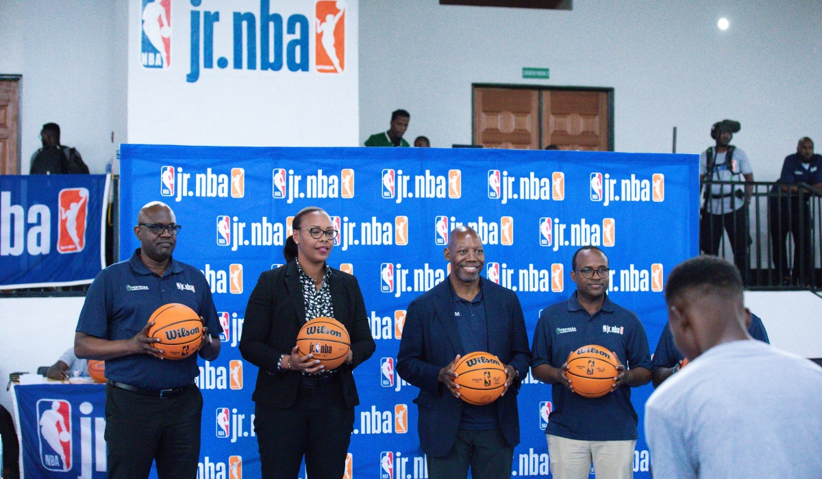 Minister of Sports Aurore Mimosa Munyagaju, flanked by NBA Africa CEO, Victor Williams, President of FERWABA ,Desire Mugwiza, Gaspard Twagirayezu, the Minister of State in charge of Primary and Secondary Education during the official inauguration of the upgraded gymnasium at Lycee de Kigali on Friday, February 10. All Photos by Dan Gatsinzi.