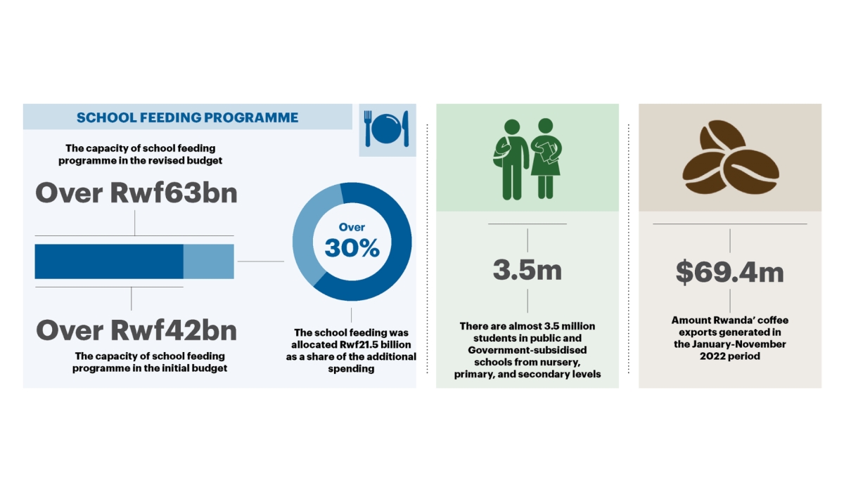 The Chairperson of the Parliamentary Committee on National Budget and Patrimony, Omar Munyaneza, told The New Times that the recently revised national budget will see Rwf76 billion – equivalent to 71 per cent of the additional budget allocated to teachers’ salaries. READ ALSO: All schoolchildren to get meals as government reviews policy The development, he said, is meant to fill the financing gap in teachers’ salaries, as the Government started implementing the decision to increase their pay when the execution of the approved budget had already started. In the mid-term budget review, the government intends to increase its spending by 2.3 per cent to over Rwf4,764 billion, from the initial over Rwf4,658 billion that was approved by Parliament in June 2022. In August 2022, the Government announced a move to increase the salary of primary school teachers by 88 per cent and that of secondary school teachers by 40 per cent effective the same month, in line with ensuring the quality of education. READ ALSO: Rwanda’s coffee exports to UAE set to grow The number of primary school teachers rose by 45 per cent from 41,573 in 2017 to over 60,000 as of August 2022, according to data shared by Prime Minister, Edouard Ngirente on Monday, August 1, while presenting to Parliament the Government activities in basic education under the National Strategy for Transformation (NST1). For secondary school teachers, the Premier indicated, they increased from 21,000 in 2017 to about 28,500 as of August 2022, implying a 35.7 per cent increment. While presenting the proposed revised budget to Parliament on February 8, the Minister of Finance and Economic Planning, Uzziel Ndagijimana, said that the additional funds will mainly go into the social sector, chiefly education and agriculture. “The additional spending will among others support key recurrent expenditures, such as increase of the number of teachers and their salaries, supporting universal school feeding programs, and additional fertilisers to boost coffee production, he said. Here is a breakdown of how the additional funds are set to be spent. Rwf21.5bn for school feeding Another area that will benefit from the additional funds is the school feeding programme, where the Government wants to increase the capacity of schools to provide meals to all students. MP Munyaneza said school feeding was allocated Rwf21.5 billion as a share of the additional spending. Meanwhile, over Rwf42 billion was earmarked for the school feeding programme in the initial budget under review. With this data, the combined financing for this programme would be over Rwf63 billion, if Parliament approves the proposed revised budget. According to the 2020-2021 education statistical yearbook published by the Ministry of Education in February 2022, there were almost 3.5 million students in public and Government-subsidised schools from nursery, primary, and secondary levels. Rwf4.7bn for coffee yield Minister Ndagijimana said they are allocated over Rwf4.7 billion for fertilisers to boost coffee production, especially because many coffee trees are old and will give yield when fertiliser is applied. He indicated that the move is intended to achieve higher coffee production for exports, “because prices are good at the market, yet we have insufficient coffee yield,” pointing out that prices of coffee went up by 40.4 per cent at the international market in 2022 compared to 2021. According to formal trade data from the National Bank of Rwanda and the Ministry of Finance and Economic Planning, in the January-November 2022 period, Rwanda’ coffee exports generated $69.4million. These data show that the country’s coffee export revenues registered an increase of 19 per cent compared to $58.3million they had fetched in the January 2021 period. The increase is attributed to a 40.4 per cent rise in coffee price to $6.12 a kilogramme in 2022, against $4.36 in 2021, according to data from the National Agricultural Exports Development Board (NAEB). For volume, the quantity of traded coffee from January to November 2022, registered a decrease of 15.3 per cent, as 11,326 tonnes were exported compared to 13,369 tonnes in the same period of 2021.