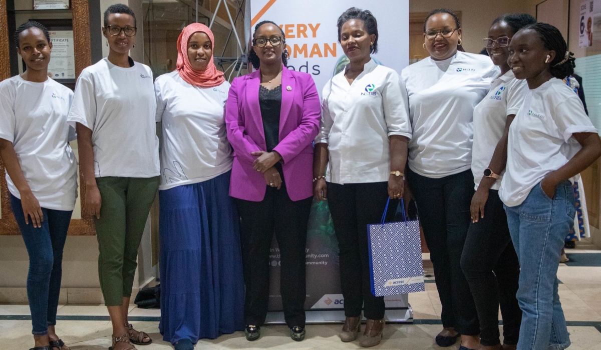 Prossie Kalisa, Executive Director of Retail and Digital Banking at Access Bank (C) poses for a photo with staff at Netis Rwanda Ltd on Wednesday, March