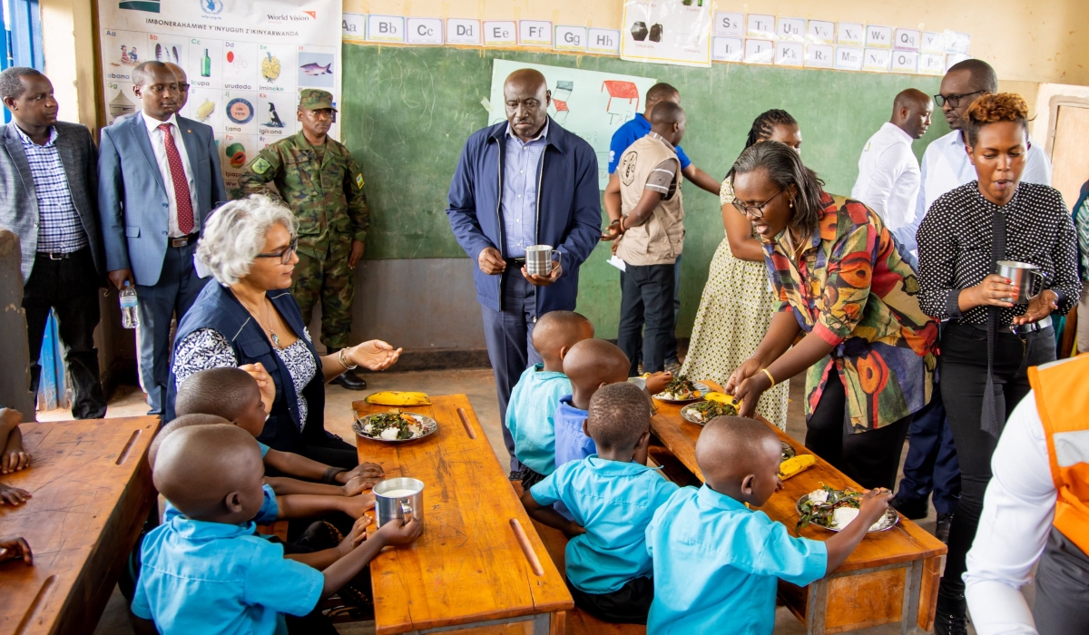 Rose Baguma, Director General of Education Policy and Analysis at the Ministry of Education, CG Emmanuel Gasana, Governor of Eastern Province together with other officials serving meal to children