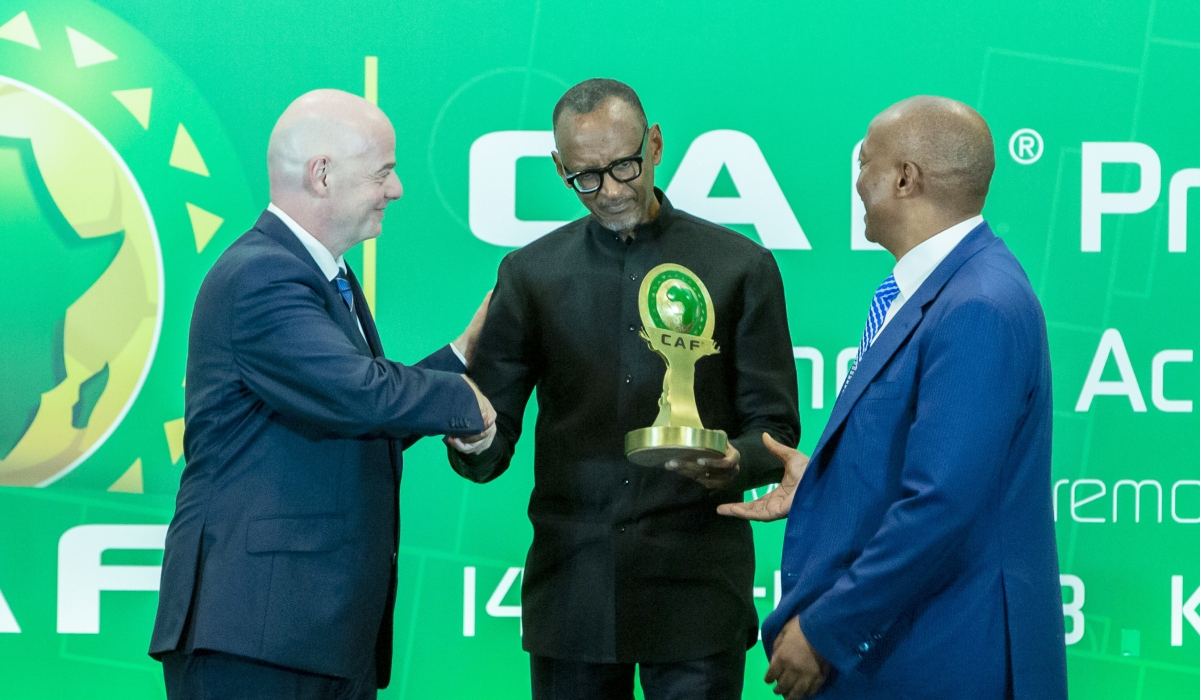 President Kagame receives the CAF President’s Outstanding Achievement Award 2022 from the President of the Confederation of African Football, Patrice Motsepe, and FIFA President Gianni Infantino in Kigali, on Tuesday, March 14. Photos by Olivier Mugwiza