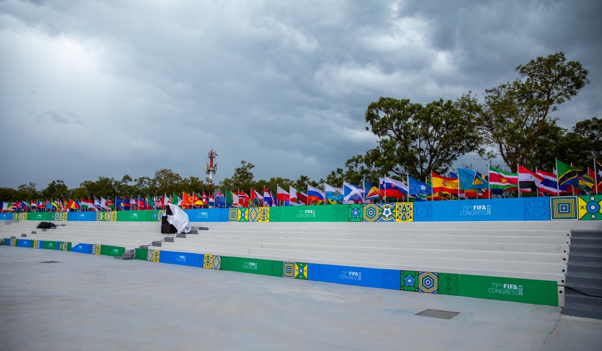 Flags of country members of FIFA are hoisted at Kigali Pele Stadium ahead of the 73rd Congress of the world football governing body FIFA which will be held in Kigali on Thursday, March 16. Photo by Olivier Mugwiza