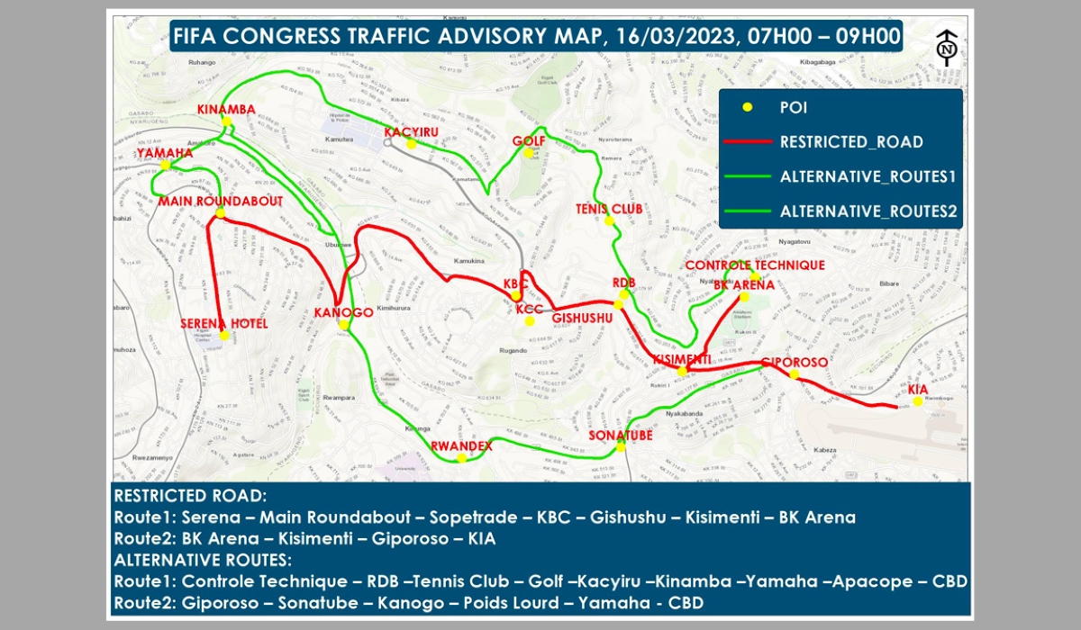 As the 73rd FIFA Congress gets underway at the BK Arena Thursday, March 16, motorists have been advised to use alternative routes to access the Kigali Central Business District and other destinations in and around the city with the police restricting access to some major roads. One of the restricted roads is the Serena-Main Roundabout-Sopetrade-KBC- Gishushu-Kisimenti-BK Arena road, while motorists have also been warned that they may not have access to the road from BK Arena-Kisimenti-Kigali International Airport. In an advisory released Wednesday evening, the Rwanda National Police said the aforementioned roads will be reserved for FIFA delegates, particularly from 7a.m-9a.m. The same roads are again likely to be closed for public for hours later in the day as delegates depart from BK Arena and then later from their respective hotels. “Restricted roads are not closed for traffic; minor interruptions may happen when giving right of way to delegates’ convoys; thereafter, traffic flow will continue normally,” RNP said. About 2,000 delegates are in Kigali for the FIFA congress, which brings together football leaders from more than 200 member associations. The police have also advised on alternative routes. For those coming from areas such as Kimironko, Rusororo and Bumbogo, they can use Controle Technique-RDB-Tennis Club-Kacyiru-Kinamba Yamaha-Apacope–CBD route, which is also likely to be clogged during peak hours. Motorists from Nyarugunga and Konombe heading downtown can avoid Giporoso by going through Sonatube-Kanogo-Poids Lourd-Yamaha–CBD route. There are also several options for people leaving Kibagabaga, Kagugu, Nyarutarama, Kacyiru and Kimihurura, among other areas.