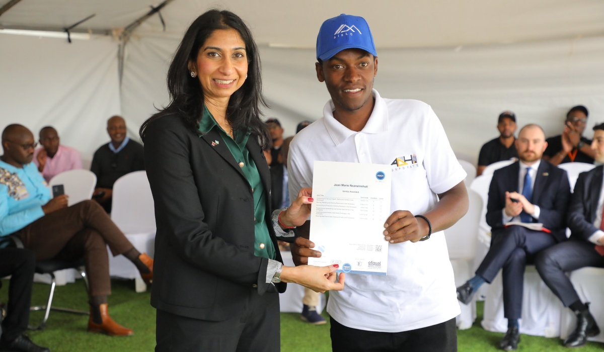 The UK Home Secretary, Suella Braverman presenting a certificate to one of the graduates of the first cohort at ADHI Technical, Vocational and Education Training (TVET) on Saturday, March 18. Photos by Craish Bahizi