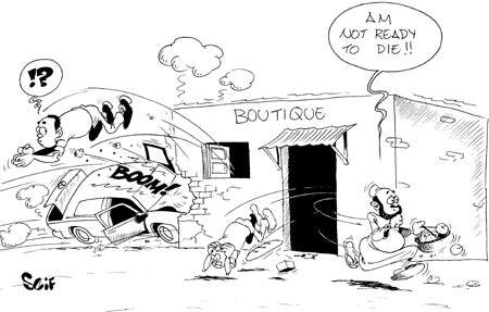 A Mercedes Benz saloon Reg. No RAB 706 I yesterday rammed into a commercial plaza in Muhanga town leaving the driver seriously injured and a shopkeeper traumatised.