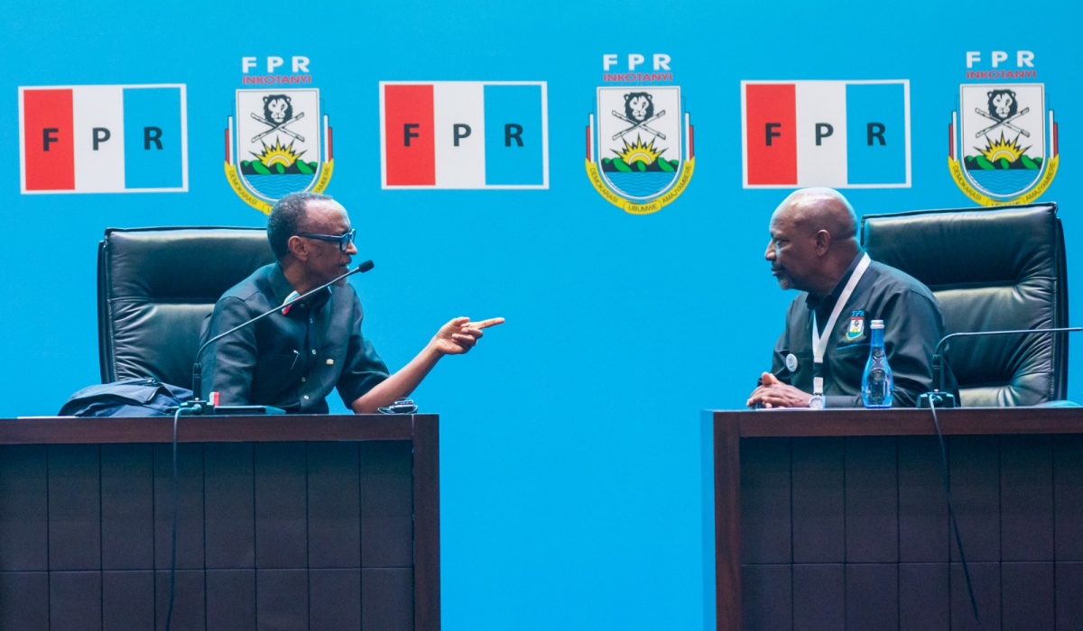 President Paul Kagame, who was re-elected as RPF-Inkotanyi Chairman, chats with Wellars Gasamagera (R), the ruling party's new Secretary General, during the 16th RPF Congress in Kigali on Sunday, April 2. Olivier Mugwiza