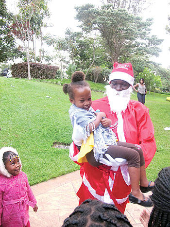A child relishes the moment of being carried by Santa as another awaits her turn.