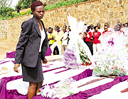 A young survivor examines the coffins containing remains of victims before they were buried at Kigali memorial site Gisozi on Monday. (Photo / J. Mbanda)