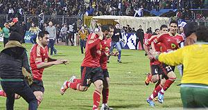 Al-Ahly players ran for their lives as rival fans streamed onto the pitch and headed towards them, throwing bottles and fireworks. Net photo.