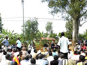 Province leaders and Kiziguro residents take part in a fierce debate before the 80 year old tree was cut down. The Holy Tree can be seen in the background. The New Times / Stephen Rwembeho.