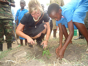 Sophie Charlotte of Rhineland Palatine Province helps a school girl plant a tree at Mutima School in Ruhango District.