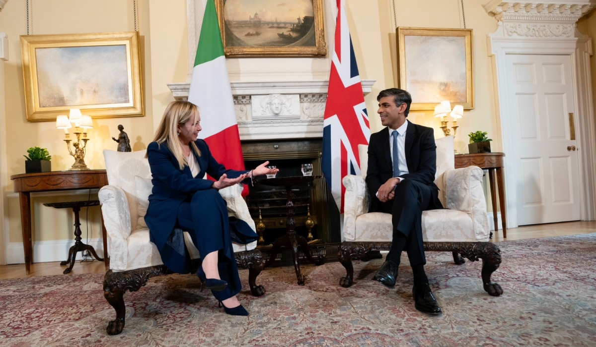 British Prime Minister Rishi Sunak and Italian Prime Minister Giorgia Meloni at Downing Street in London, Britain, on April 27, 2023. Meloni said Britain's plan to send migrants to Rwanda was a deal between two free nations which are safeguarding the safety of the people.