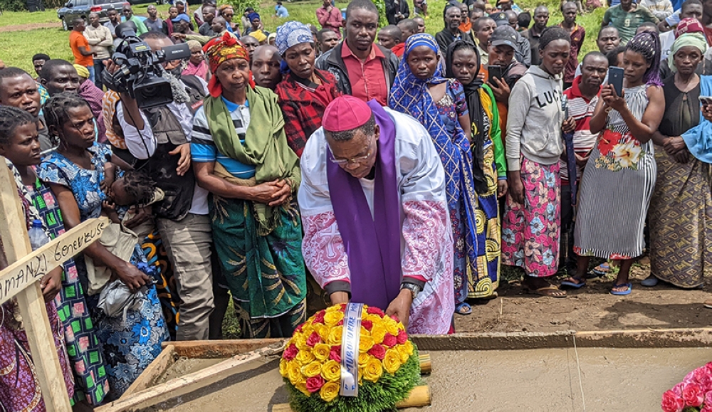 Anaclet Mwumvaneza of Nyundo Catholic Diocese lays a wreath on one of the graves of the victims of flood and landslide disasters in Rubavu District on Thursday, May 4. Photo by Germain Nsanzimana