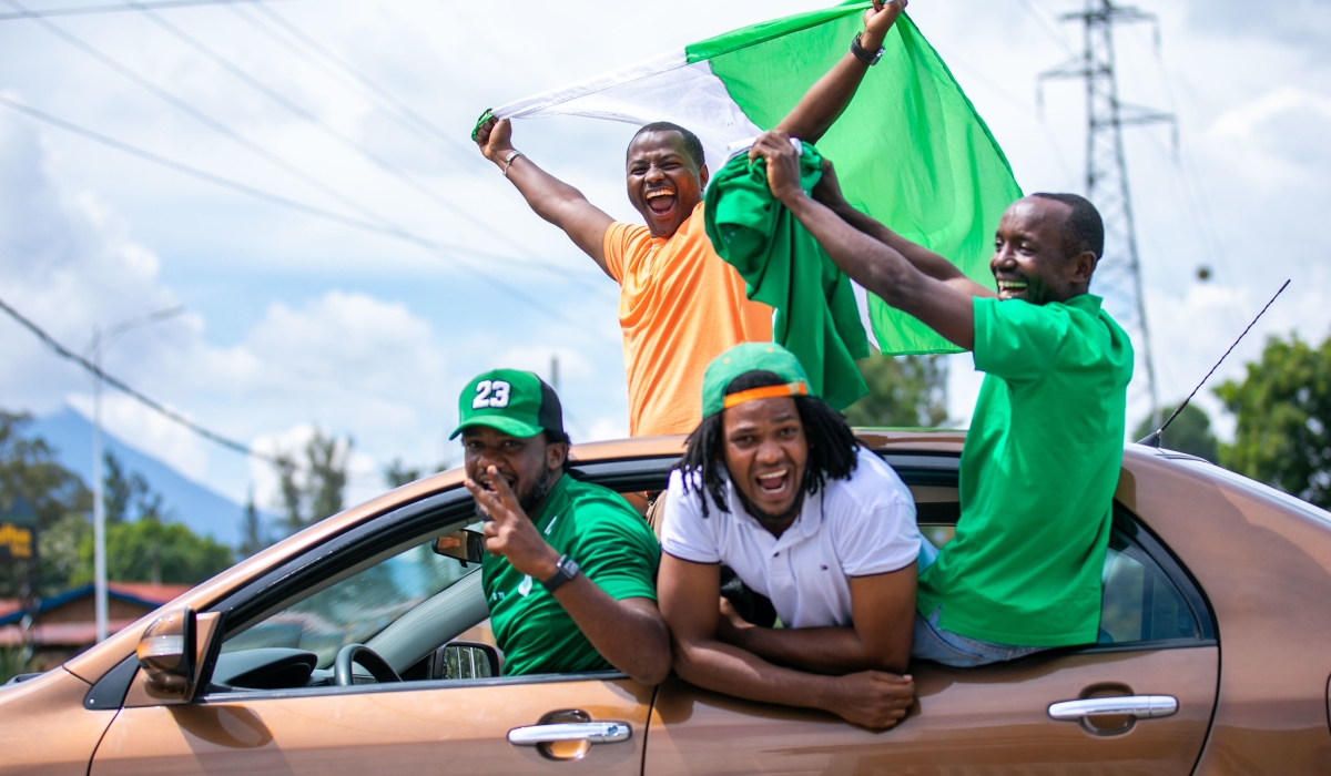 RTV showbiz reporter Lucky Nzeyimana with other SC Kiyovu fans raise the team's flag on their way to Musanze to support their side at Ubworoherane Stadium on Sunday, May 7. All Photos by Olivier Mugwiza