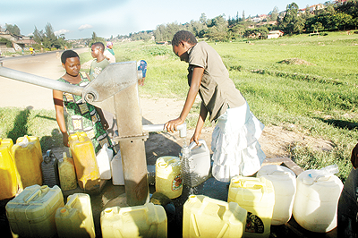 WATER IS LIFE. Residents queue at a water pump. The New Times / File.