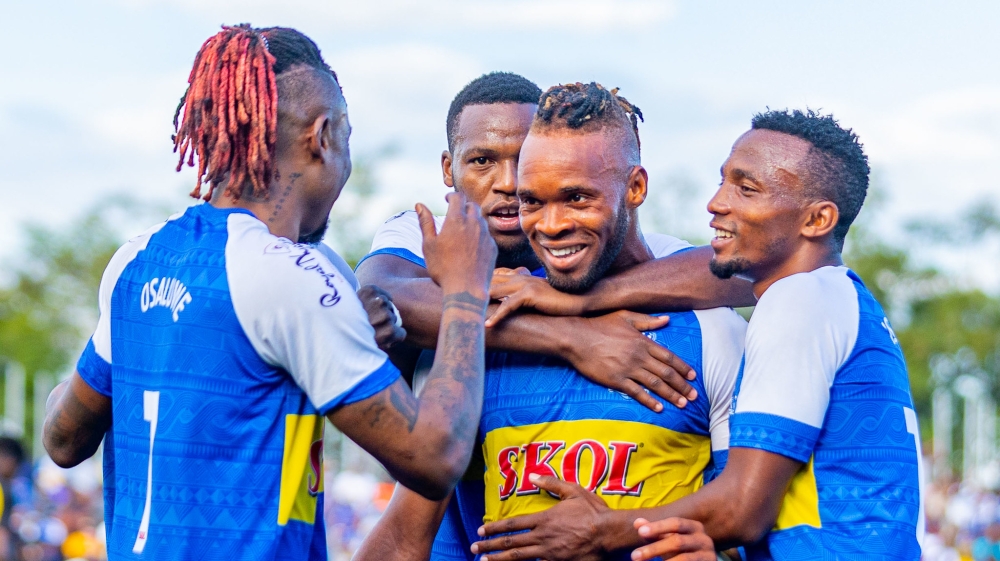 Rayon Sports striker Léandre Willy Esombe Onana celebrates his goal with the teammates as his side eliminate Mukura VS during the Peace Cup at Kigali Pele Stadium. Photos by Olivier Mugwiza