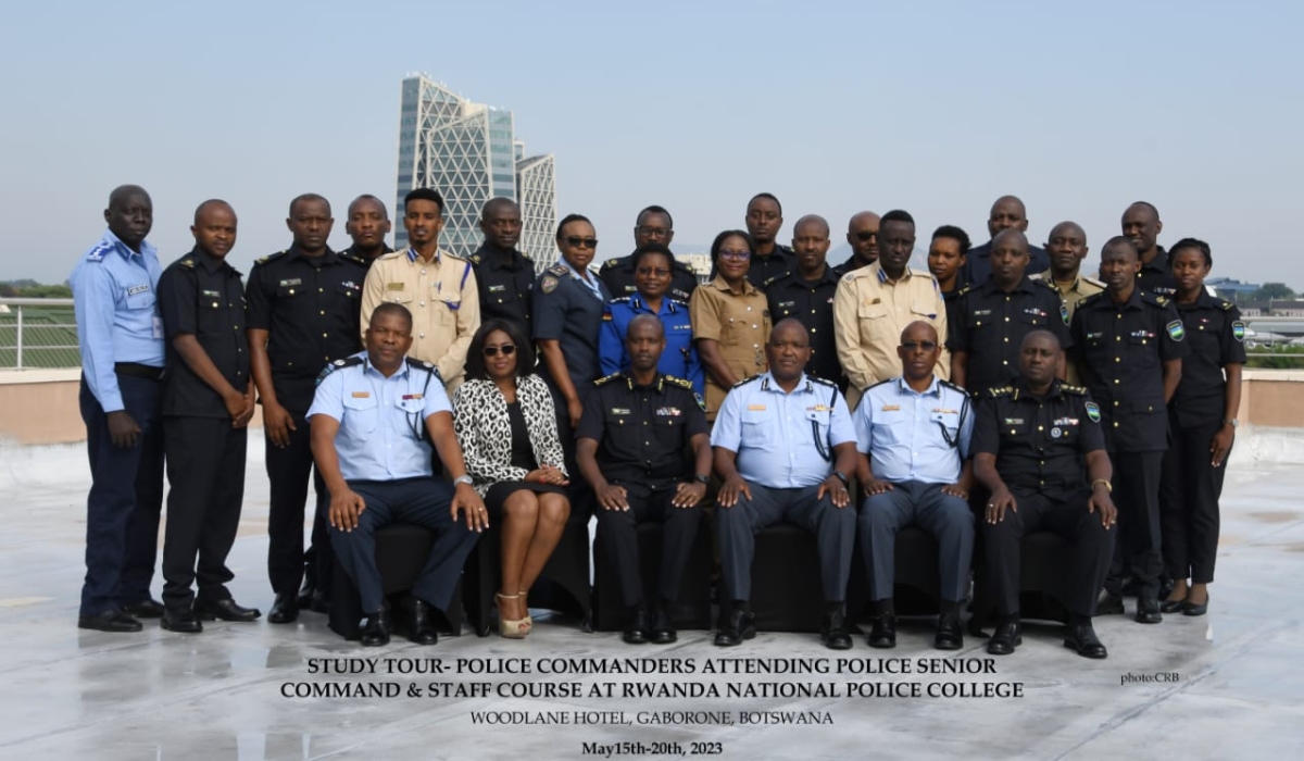 The Police Senior Command and Staff Course (PSCSC) students started a week-long external study tour in Botswana on Monday, May 15, as part of the one year academic programme at the National Police College (NPC) in Musanze District. Thirty-five law enforcement officers from 10 African countries are part of the 11th PSCSC intake. The Police students are from Ethiopia, Kenya, Malawi, Namibia, Lesotho, Nigeria, Somalia, South Sudan, Tanzania and Rwanda. The external study tour is held under the theme: Socio-economic development, good governance and justice as pillars of sustainable peace and security. On the first day of the tour, on Monday, the students visited Botswana Police Service, where they were given insights into various disciplines of security, peace, justice and governance. Presentations focused on the impact of law enforcement agencies in socio-economic development and justice, and how intelligence contributes to the protection of individual rights, prevention of crime and how it sets ground for economic development and justice. They were also explained on how financial intelligence contributes to stabilizing financial system, including fighting money laundering and terrorism financing, among others. Botswana Police Service Deputy Commissioner for Operations, Solomon S. Mantswe, who received the law enforcement students, lauded the existing good bilateral relations between Botswana Police and Rwanda National Police (RNP). The two police institutions signed a cooperation agreement in January this year, to formalized partnership in fighting transnational organized crimes including terrorism related activities, human trafficking, hi-tech and cybercrime as well as exchange of information related to criminal elements. Others areas of partnership include capacity development through training, and sharing of expertise. Ensuring effective policing requires an agile, highly motivated and digitized police service capable and ready to invest more in human capital development, partnership, research, innovation and modern technology, Mantswe reiterated. He urged the students to take advantage of the course, share experiences, and benchmark best practices in law enforcement for their personal and institutional development. The NPC commandant, Commissioner of Police (CP) Rafiki Mujiji, who heads the delegation, thanked the Botswana Police Service for hosting this year's external study tour. He noted that study tours translate theoretical learning into reality and that visiting Botswana was a deliberate decision to benchmark from good practices. The one year course has five main components; a Master’s in peace studies and conflict transformation, operational and routine staff work, strategic leadership and management, international computer driving license, and peace support operations.