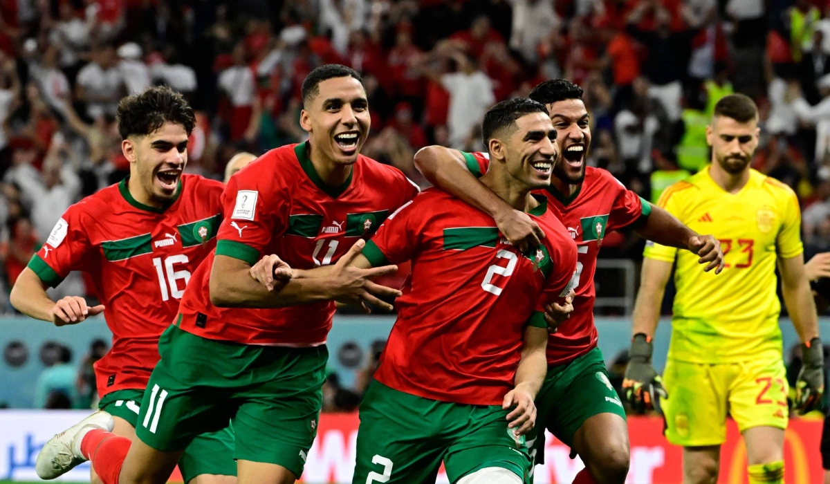TOPSHOT - Morocco's defender #02 Achraf Hakimi (2nd R) celebrates with teammates after converting the last penalty during the penalty shoot-out to win the Qatar 2022 World Cup round of 16 football match between Morocco and Spain at the Education City Stadium in Al-Rayyan, west of Doha on December 6, 2022. (Photo by JAVIER SORIANO / AFP)