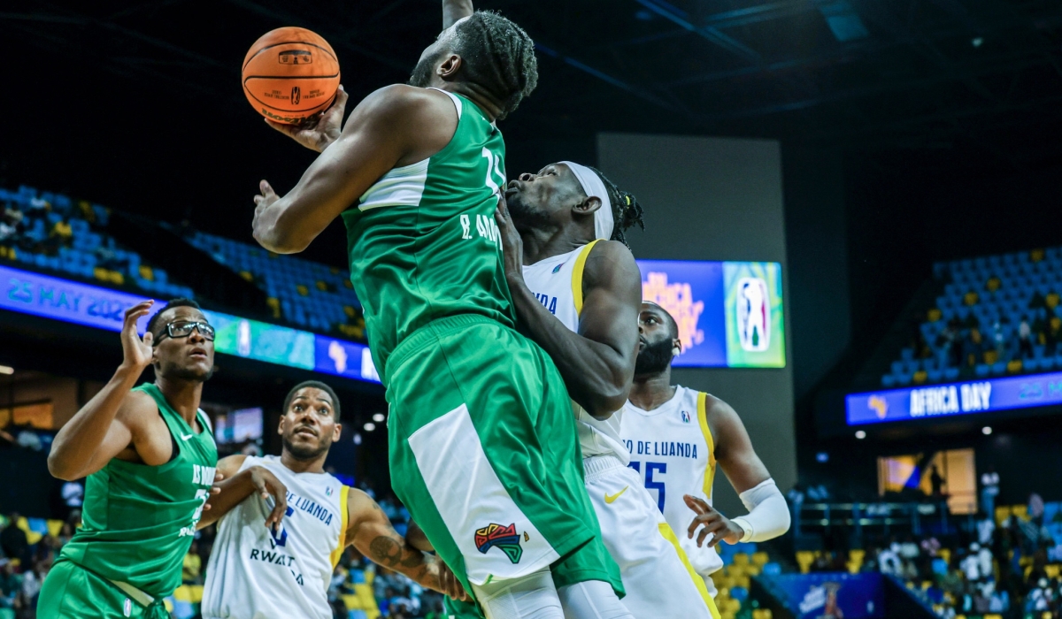 AS Douanes players vie for the ball with Petro de Luanda's giants during the game . The Senegal based team stun Angola's 92-86 in the semi-finals on Wednesday at BK Arena. All Photos by Olivier Mugwiza.