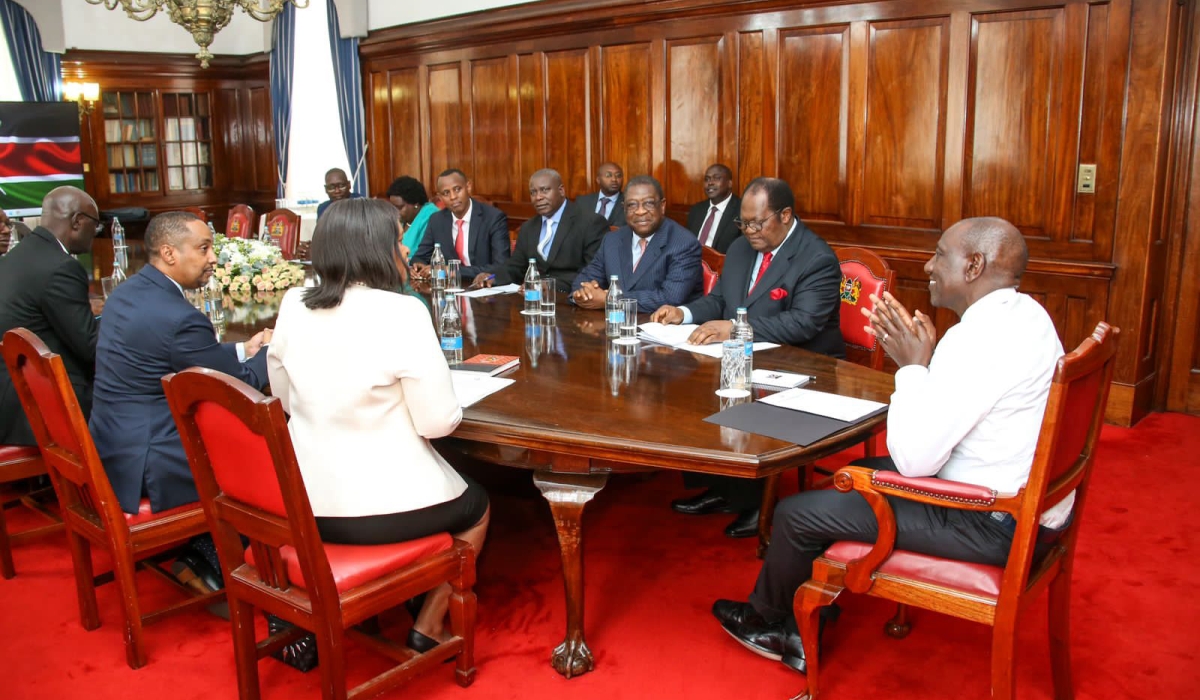 Kenyan President William Ruto (centre), in a group photo with EAC Cabinet Secretary Rebecca Miano (fourth right), and Justice Benjamin Odoki (third left) and other officials at State House, Nairobi, on May 25, 2023
