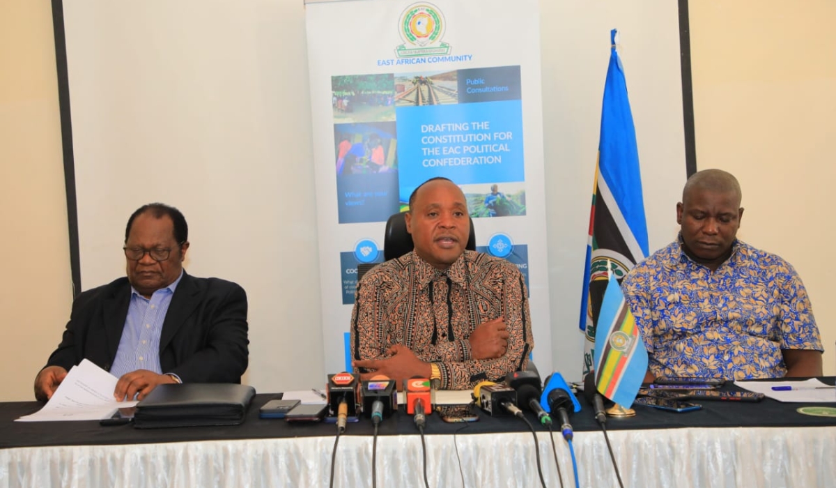EAC Secretary General Peter Mathuki (C), and Justice Benjamin Odoki the Chairperson of the Committee of Experts tasked with drafting the Constitution for the proposed EAC Political Confederation (L), among speakers at the press conference on May 28, 2023, in Kenya. (Courtesy)