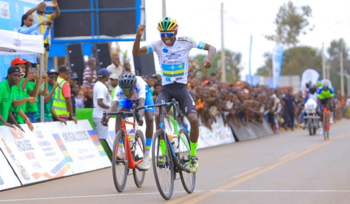 Rider Eric Manizabayo celebrates after winning Sunday’s stage of Akagera Race from Nyagatare to Kayonza. The Benediction Club rider is part of Team Rwanda roster departing Kigali on Tuesday for the forthcoming Tour du Cameroun due from June 3-11-Courtesy