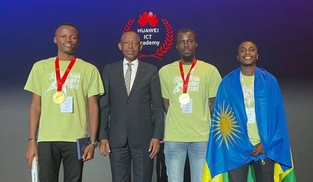 Rwanda's envoy in China Amb James Kimonyo poses for a photo with the three UR students, Regis Minani, Magnifique Mugiraneza, and Michael Fred Mugisha who excelled at the 2023 Huawei ICT Competition. Courtesy