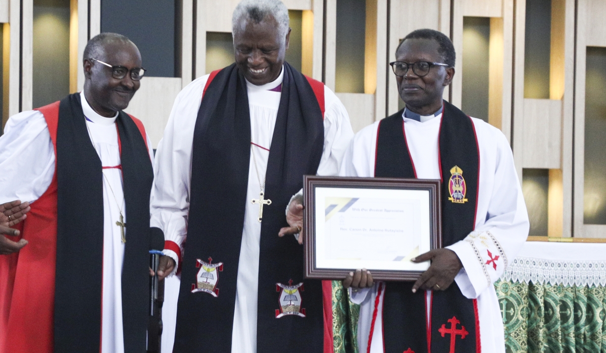 Archbishop of the Anglican Church of Rwanda Laurent Mbanda (C) and Bishop of Kigali Rev Nathan Rusengo Amooti (Left) hand over a certificate of appreciation to Rev Antoine Rutayisire during the inauguration of a new church of EAR Remera Parish in Gasabo on Sunday, June 4. Photo by Emmanuel Dushimimana