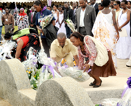 Some of the family members and officials lay wreaths on the graves of politicians killed during the 1994 Genocide, at their cemetery on Rebero Hill. The New Times / File.