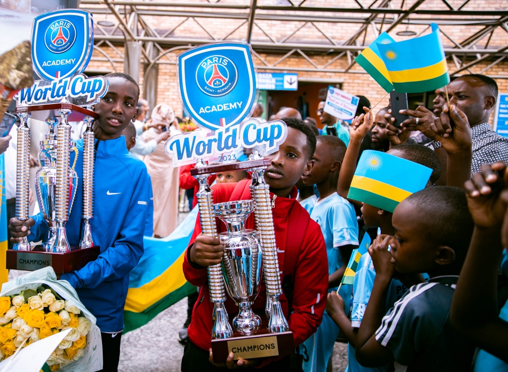 The U11 team captain, Samuel Shema (blue jacket) and the U13 team captain, Crispin Manzi Kanamugire (red jacket), display their trophies to a big number of fans soon after the squad’s arrival at Kigali International Airport. The PSG Academy Rwanda squad, in the U11 and U13 categories, returned home to a heroes’ welcome, on Wednesday, June 7. All photos by Christianne Murengerantwari