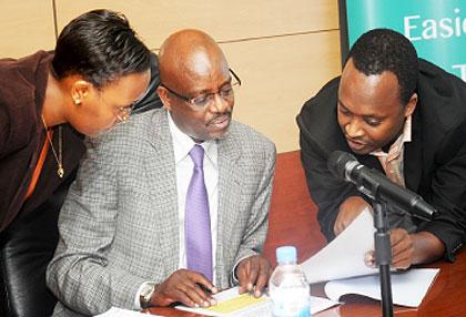 Rwanda Revenue Authority Commissioner General, Ben Kagarama (C) consults Deputy Commissioner for Small and Medium taxpayers Richard Dada (R) and Director for Planning and Research Agnes Kanyangeyo at a press conference on Thursday. The Sunday Times / Jo