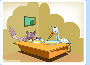 A selfish fox once invited a stork to dinner at his home and for a joke put nothing before her but some soup in a very shallow dish. The fox could easily lap this up, but the Stork could only wet the end of her long bill in it, and stayed hungry.