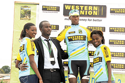 Adrien Niyonshuti (C) wears the Green Jersey for being the top in Rwanda rider. The New Times/P. Kamasa.