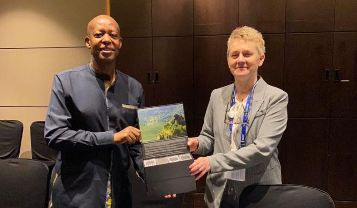 Silas Udahemuka, Director General at Rwanda Civil Aviation Authority and Silke Buckley, Head of Training and International Operations at CAAi, pose for a picture at the signing of the MoU. Courtesy