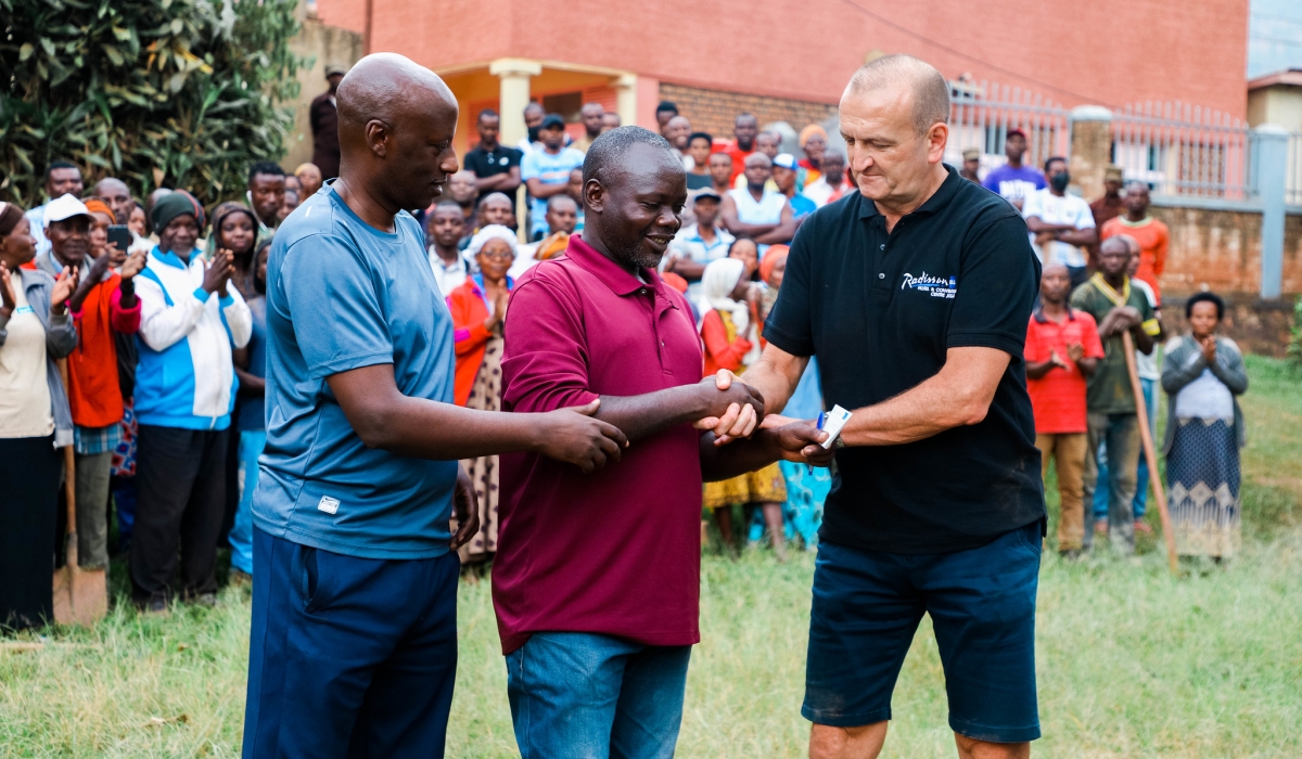 Rob Kucera, the District Director of East Africa, Complex General Manager - Radisson Blu Hotel and Convention Centre hands over the Community-Based Health Insurance, known as 'Mutuelle de Sante' for 300 families in Jali.