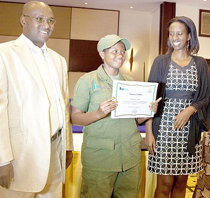 Denyse Umugwaneza (C) displays her certificate after completing a Diploma programme in Wildlife Management as head of tourism and conservation at RDB Rica Rwigamba (R) and Muhamed Feruz from Burundi look on, Friday.