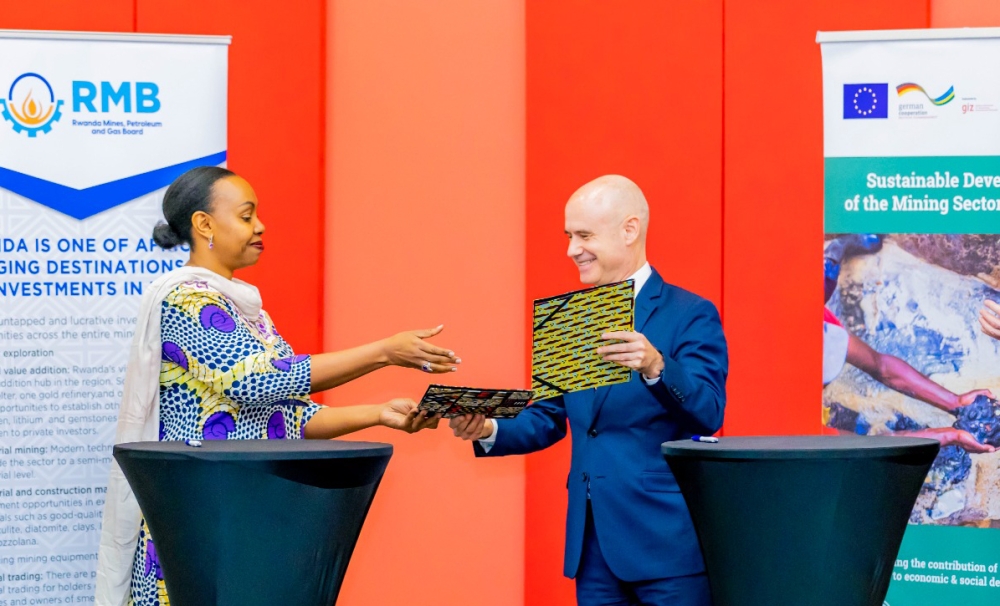 Yamina Karitanyi, Chief Executive Officer of the Rwanda Mines, Petroleum, and Gas Board and Martin Kraft, GIZ Country Director exchange documents during the signing of the agreement in Kigali on Monday, June 26. Courtesy