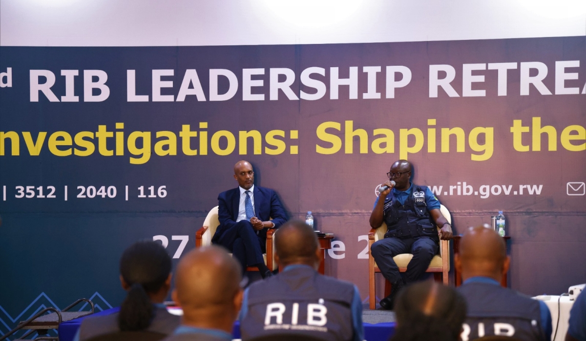 Justice Minister Emmanuel Ugirashebuja and RIB’s Secretary General Jeannot Ruhunga during the conclusion of a three-day investigators’ retreat on Thursday, June 29 in Nyamata, Bugesera District. Courtesy