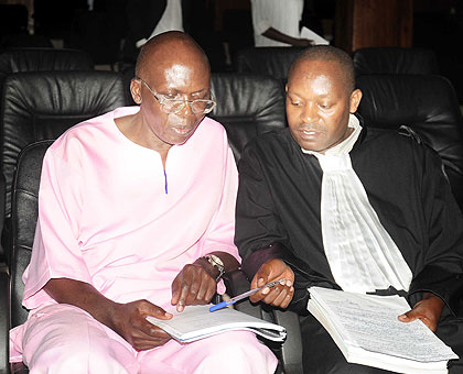 Mugesera consults with his lawyer Felix Rudakemwa during an earlier proceeding. The New Times/ File