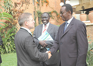 Premier Makuza (R) greets a foreign delegate at the conference yesterday, while Minister Karugarama looks on. (Photo/ J. Mbanda).