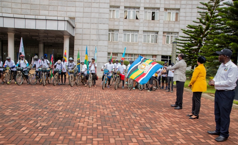 The Minister of State in charge of East African Community Affairs, Prof. Manasseh Nshuti, on Wednesday, September 7, flagged off a group of cyclists that departed to Uganda as part of an ongoing bicycle tour in the East African Community. Dubbed the Great Africa Cycling Safari, the tour brings together cyclists from partner states who ride through the EAC as a team to promote regional integration. The cycling tour, which is in its fifth edition, comprises 35 cyclists representing their respective. They commenced the tour on August 1, in Mombasa, Kenya and have so far passed through Arusha, Dar es Salaam, Dodoma in Tanzania before taking to Bujumbura, in Burundi. They arrived in Rwanda on Monday, September 5, where, among other activities, they participated in environment conservation activities in Gashora Sector before proceeding to Kigali to visit the Kigali Genocide Memorial. The cyclists met Nshuti before proceeding to Uganda. Nshuti hailed the cyclist’s role in educating the people they meet about regional integration. “Like their motto states ‘One People One Destiny’, we have so many things in common and joining hands as a unit makes us stronger. These cyclists do the tour not just ride a bike but to also help us raise awareness about the role of East African Community and the coming together of the people of the region,” Nshuti said. According to John Balongo, the Founder and Director of Great Africa Cycling Safari, the tour experience has this time round been both good and bad. “It was good, on one hand, because security of the cyclists is being taken care of at all costs in every country they pass and we are glad that the tour is at least half-sponsored with the support by private sector,” Balonga said. “But we have had a challenge of climate change at some pots where some places are very hot and some places are extremely cold. Also, in a group of cyclists from countries that speak different languages, you find it hard to make clear communication. But we managed because most of them use either Kiswahili or English.” The cyclists will conclude their tour in Kenya. In the end, they will have cycled around the region for 55 days and covered a distance of more than 6,000 kilometers. At the end of the tour, every participating cyclist will be recognized with an award.