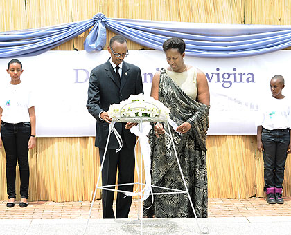 President Paul Kagame and First Lady Jeannette lay a wreath at the Genocide Memorial Centre in Gisozi yesterday. The New Times/ Village Urugwiro.