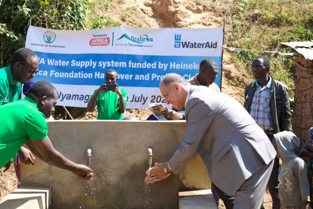 Nyamagabe, July 17, 2023 - The HEINEKEN Africa Foundation (HAF) through Bralirwa Plc., in partnership with WaterAid Rwanda and the Ministry of Health launched WASH facilities to promote access to safe water and hygiene behavior change in the community of Kitabi sector in Nyamagabe district. The joint water access, sanitation, and hygiene (WASH) project, which began in April 2020 during the onset of the COVID 19 pandemic to empower under-served communities with sustainable access to WASH facilities and lifesaving hygiene education, was launched in three phases, in the districts of Bugesera, Rubavu, Nyagatare, Rwamagana, Kigali and lastly in Nyamagabe district. During the final phase of the project, six new water points were constructed in Shaba and Uwingugu cells of Kitabi sector in Nyamagabe district which are expected to support over 3000 community members. Since the launch of the project, WaterAid Rwanda has been able to support over 408,800 people through installations of WASH facilities in different communities, schools, health centers as well as promotion of hygiene behavior change messaging through social, digital, and mass media campaigns. “Access to water and sanitation facilities has never been more critical than in the times we have all been through due to Covid pandemic. It is through concerted efforts that we are able to create long lasting impactful intervention as we forge a path towards a safer, healthier future for all said Jean Paul Mbarushima Head of Programmes, WaterAid Rwanda. Since 2007, the HEINEKEN Africa Foundation (HAF) has focused on improving the health of people living in Sub-Saharan Africa with a key focus on improving access to water access, sanitation, and hygiene. During the COVID 19 pandemic, HAF scaled up and accelerated its WASH activities and through partnership with WaterAid, donated €625,000 (Rwf 792,000,000) as part of its emergency response program to be implemented in three phases in Rwanda. “Is it through such ambitious collective actions that we can be able to sustainably improve lives and support the communities where we serve,” said Mr. Etienne Saada, Managing Director of Bralirwa PLC, a subsidiary of HEINEKEN Group. “Bralirwa is committed to collaborating with the government among other key development stakeholders as we raise the bar on our support on the SDGs through our corporate social responsibility” he added. Dr. Parfait Uwaliraye, Head of Planning, M&E and Health Financing Department in the Ministry of Health commended Bralirwa and WaterAid Rwanda for their invaluable contribution and collaboration with the Ministry to implement targeted WASH interventions to mitigate the spread of COVID-19 and other infectious diseases. “Promoting hygiene behaviour change and increasing access to WASH facilities greatly empowers communities to improve the quality of health care and more importantly bolsters the resilience of the health system at large” said Dr. Parfait.