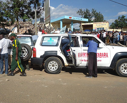 Rescuers carry victims pulled out from the rubble into a waiting ambulance. The New Times / Dan Ngabonziza.