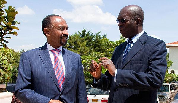 Gabriel Negatu the regional Director of East Africa Resource Centre (L) chatting with Anastase Murekezi Minister of Public Service and Labour, during a high level African meeting on Public administration and management.u00a0The New Times / T. Kisambira.