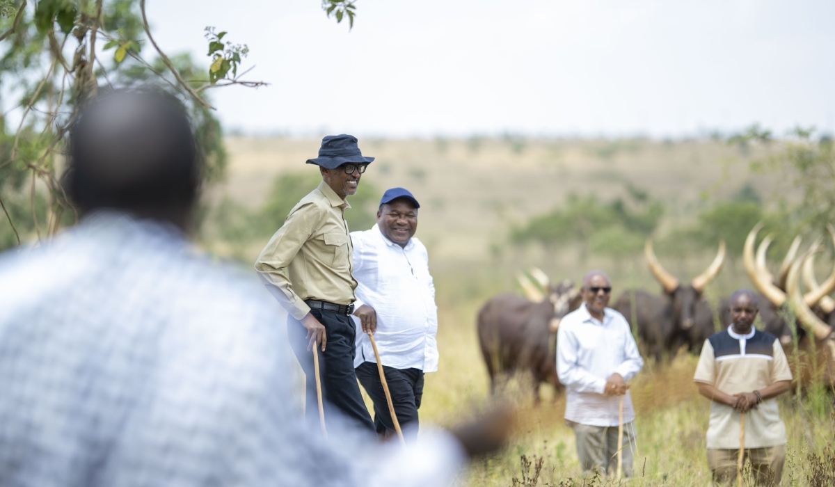President Kagame and his Mozambican counterpart President Nyusi during a tour of his farm where he gifted him with Inyambo cows at Kibugabuga in Bugesera District, on Saturday, July 29. Photo by Village Urugwiro