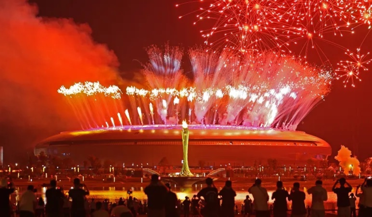 Fireworks explode as the flame is lit during the opening ceremony of Chengdu FISU World University Games in Chengdu, in China's southwestern Sichuan province on July 28, 2023. [CNS via AFP]