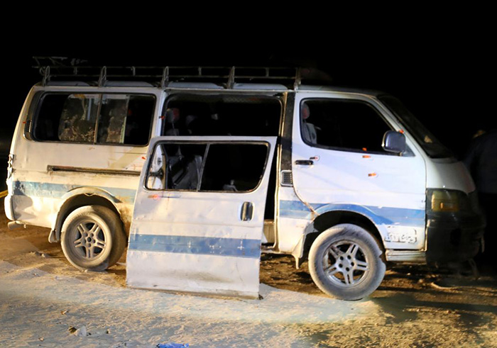 Policemen stand beside the microbus which carried Coptic Christians when gunmen opened fire in Menyia, on Friday. Net photo.