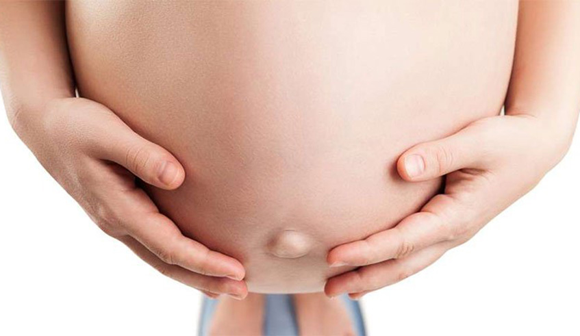 A pregnant woman touching her abdomen standing on weight balance. Net photo.